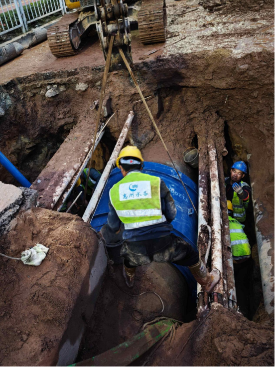 漏點鎖定,但難題也擺在了維修人員面前:目標管道上方的燃氣管與高壓電纜管,如同懸在頭頂?shù)摹袄麆Α?,留給搶修作業(yè)的凈空不足一米。任何不當?shù)拈_挖或震動都可能引發(fā)不可預(yù)知的連鎖風險。 “這是管道‘心臟’區(qū)域的精細手術(shù),不能有毫厘之差。”市供水公司迅速協(xié)調(diào)仲愷交通事務(wù)中心、仲愷交通路政股、惠環(huán)交警中隊、燃氣、電力、通信等部門,取得施工許可與協(xié)同保障后,制定了“不停水、微創(chuàng)開挖、快速夾堵”的搶修方案。