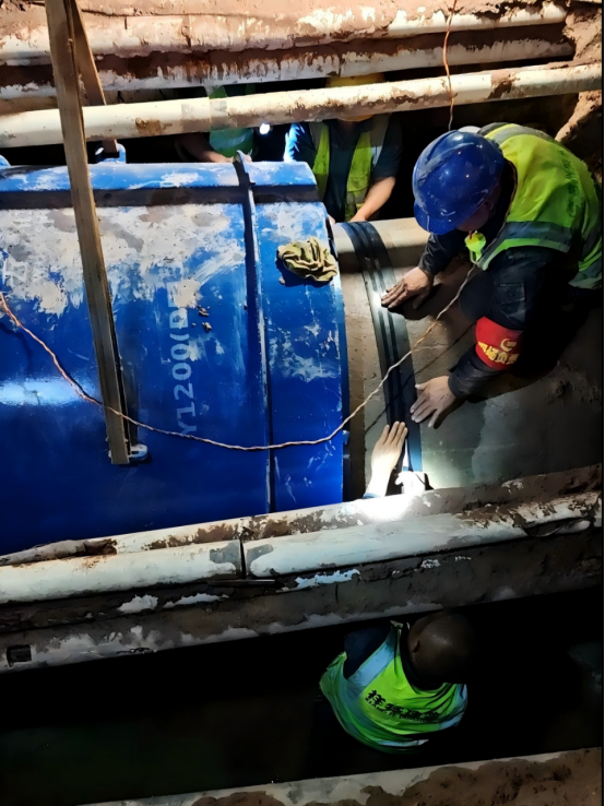 開挖現(xiàn)場變成了一個燈火通明的“地下手術(shù)室”。鉆孔機靜立一旁,搶修隊員們依靠人力,像考古學家般小心翼翼地在管線夾層中清理出作業(yè)面。泥水混雜,空間逼仄,抽水泵在一旁不知疲倦地轟鳴,將不斷滲出的積水及時排走。每一次鐵鏟的起落,隊員們都格外專注。 泥漿與地下滲水濕透了工裝,但所有人的注意力都高度集中于一點:將那副特制的、重達數(shù)百公斤的“搶修夾”精準吊裝到位。它如同一個巨大的“血管夾”,在漏點處被穩(wěn)穩(wěn)合攏、緊固,憑借強大的密封力瞬間止住漏水。整個過程,管道壓力平穩(wěn),未影響區(qū)域正常供水。
