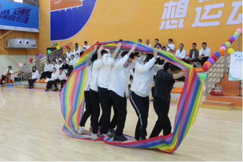 “無敵風(fēng)火輪”中,隊(duì)員們化身“人形履帶”,彩色布條滾出團(tuán)隊(duì)節(jié)奏;“同心擊鼓”環(huán)節(jié),8人拉繩顛球,每一次彈跳都是默契的見證;“兩人三足”項(xiàng)目,“綁住的是腿,連起的是心”,賽場(chǎng)秒變大型默契考驗(yàn)現(xiàn)場(chǎng)。女子投籃賽的颯爽英姿、中青年籃球?qū)沟募で榕鲎玻鼘⒒顒?dòng)推向高潮。